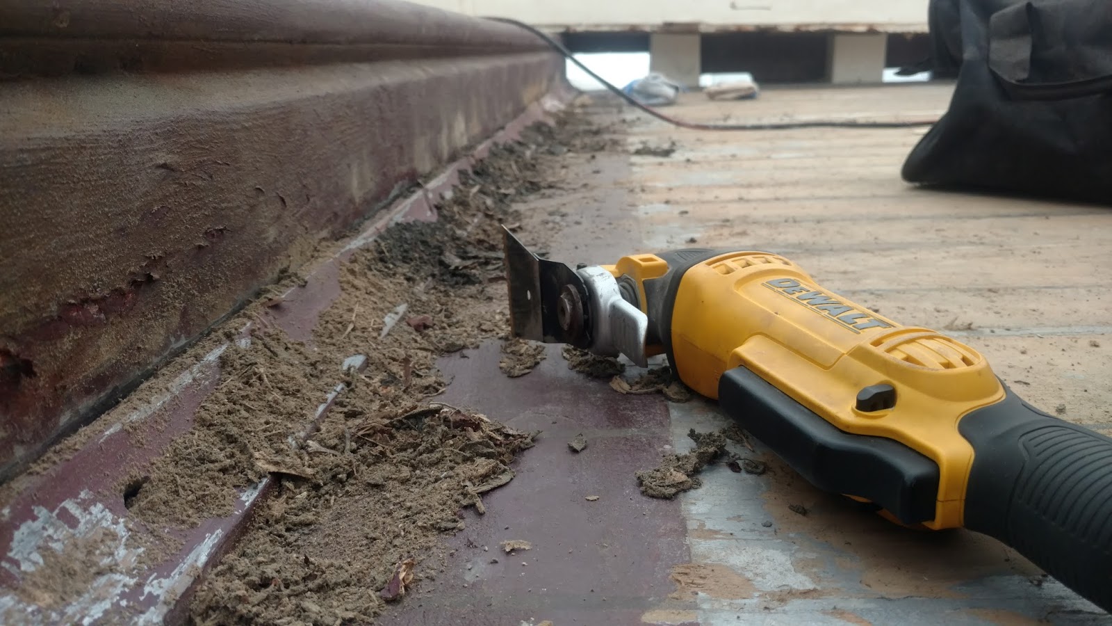 Today certainly felt longer than yesterday. For nearly the entire day I was at the smart end of an “oscillating multi-tool”; a very fancy name for something that shakes back and forth with a blade at the end. I used this tool to scrape up the rubber that had sealed the trim at the break of the deck. To get all of this out I scraped behind and underneath the trim for hours, trying to catch as much of the rubber sealant as I could. While I was grateful to have the multitool to help me, it vibrated violently whenever I dug in which was not so awesome. At the end of today, I have one half of the trim removed, and the other have nearly ready to remove. I’m not sure what I’ll do after I remove it, but I’ll just have to wait and see.